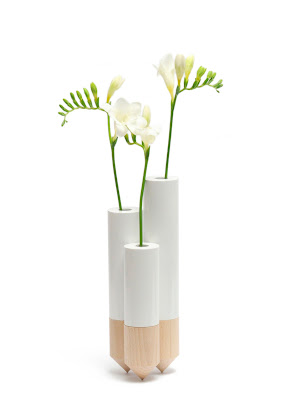 "It is the simple stacke which serves to bound the fields which inspired me this project. A simple cylinder which ended in cone and which extremity is, both thick and fine, aggressive and soft, solid and fragile. PIK: 3 soliflores as 3 small stakes which, together, stand slightly, delicately, elegantly."