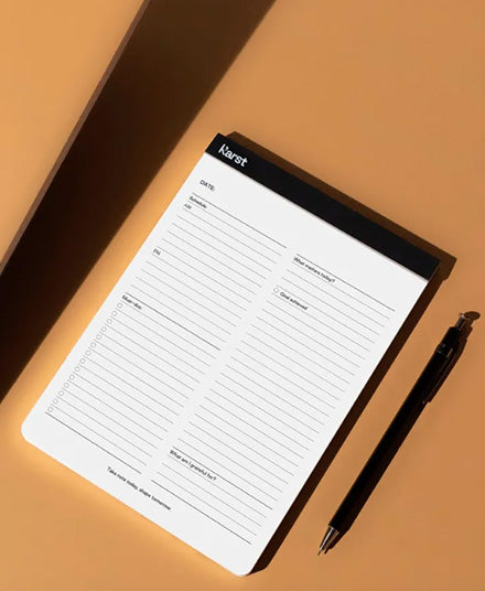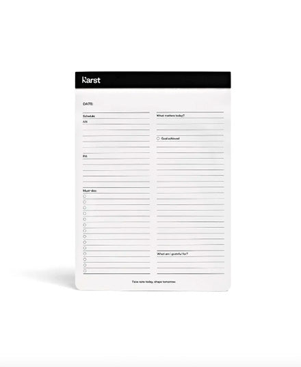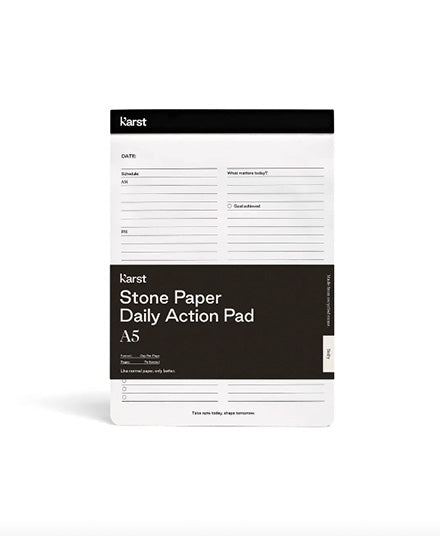 Karst's tree-free A5 Daily Action Pad is an essential for any desk. This undated all-in-one Daily Action Pad tracks your schedule, tasks, goals and notes every day. With a top flip binding, write or draw comfortably from any angle, and remove each sheet with ease along the micro-perforation. The unique, eco-friendly stone paper material is acid-free, bright white, and waterproof, with a premium look and feel.